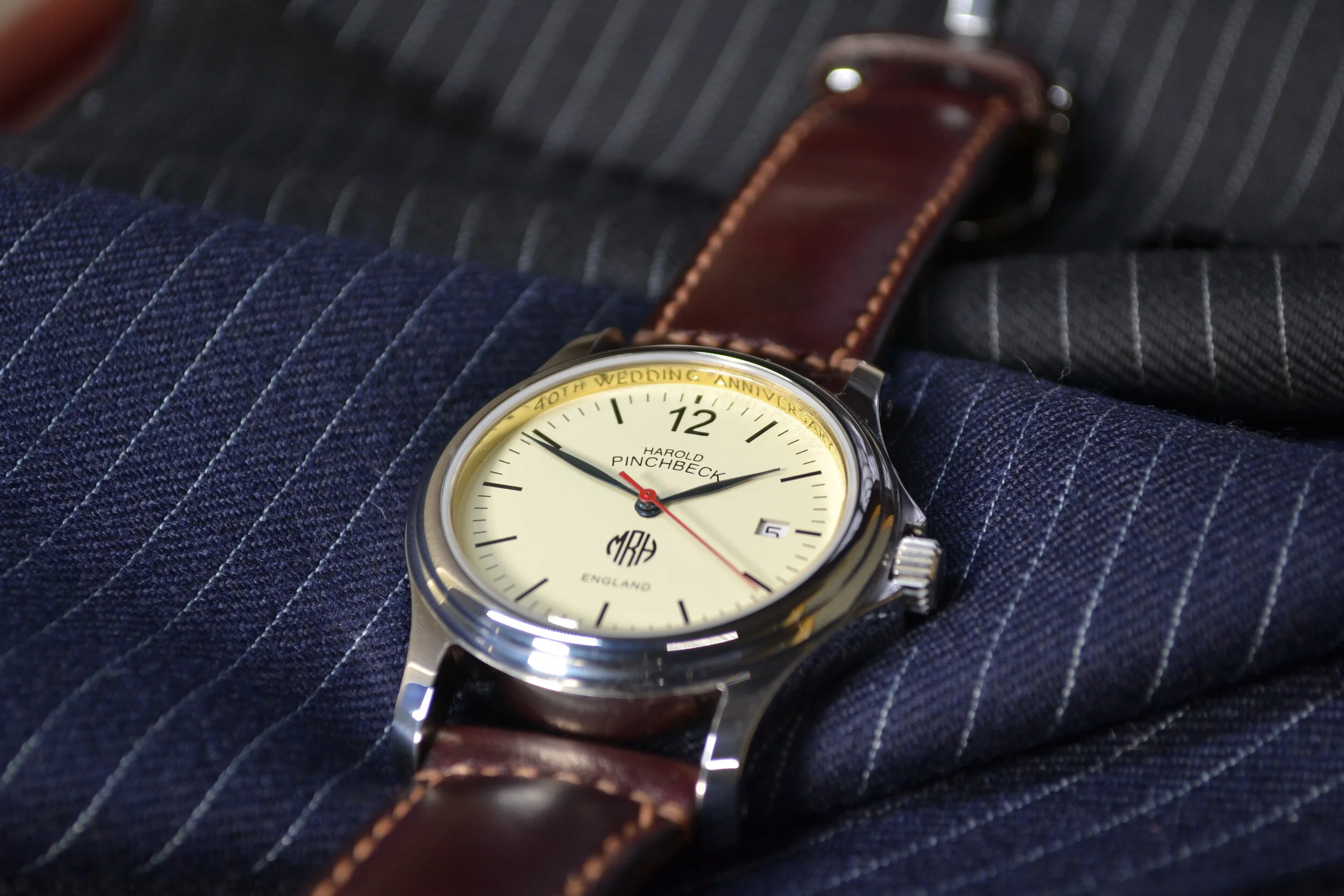 We created this watch for our customer’s Ruby Wedding celebrations. The personalised dial design was printed in red on a white background, and the red Tanner Bates strap was embossed with the customer’s initials. As a finishing touch a ruby cabouchon was set into the crown, and the caseback engraved with a personal inscription.