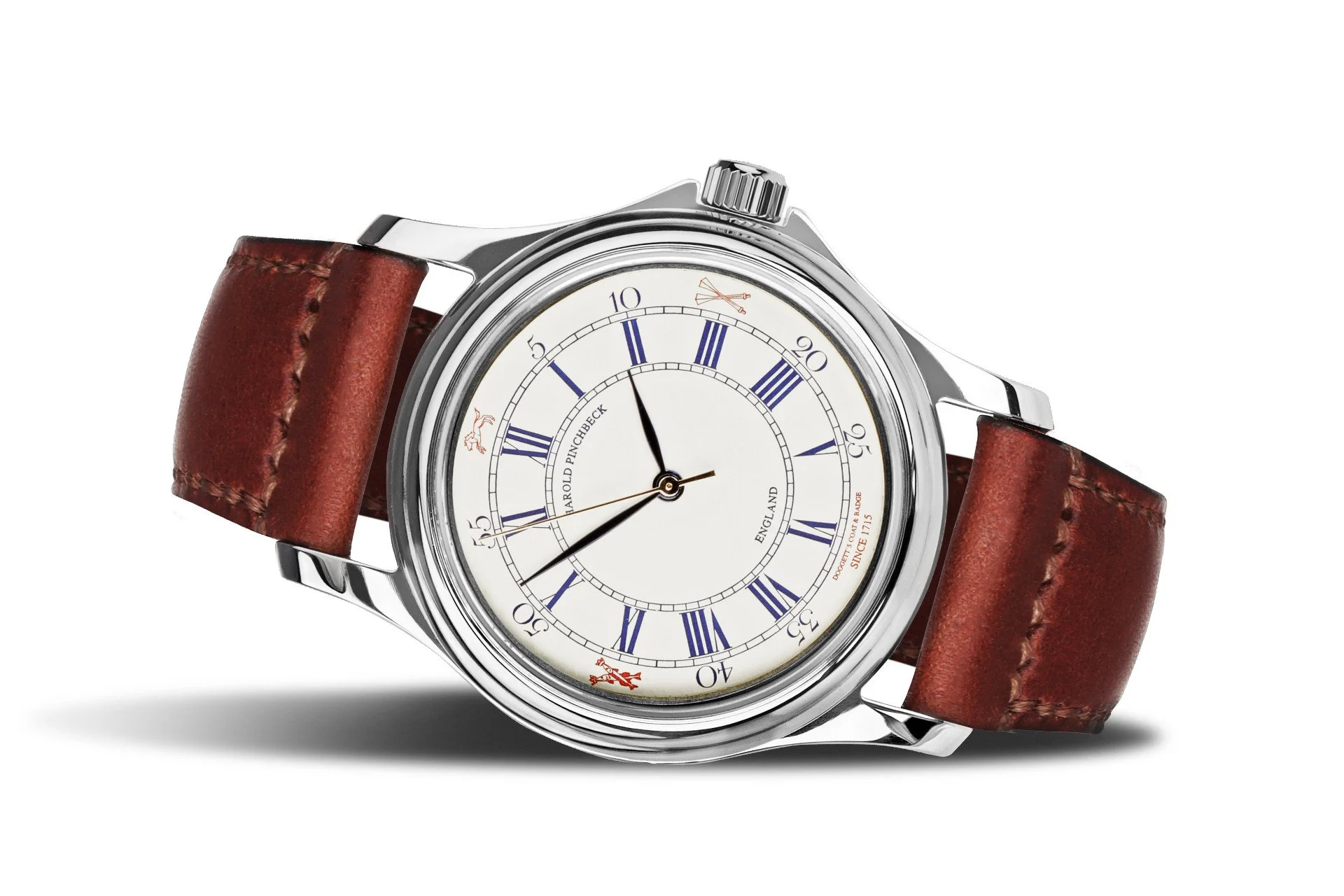 Only 25 examples of this beautiful and distinctive Harold Pinchbeck watch will ever be made, giving it the potential to become a collector’s piece. The Chelsea Reach has several discreet touches of luxury: a gold disc, inset in the case back, is engraved with the watch’s individual number, and the name and year of manufacture on the ring between the glass and the dial. Its English-made case, embellished with 18 carat gold, complements the traditional dial, whose symbology includes the Hanover Horse, and reflects the Race’s rich heritage through its connections with the Fishmongers’ Company and the Company of Watermen and Lightermen.
