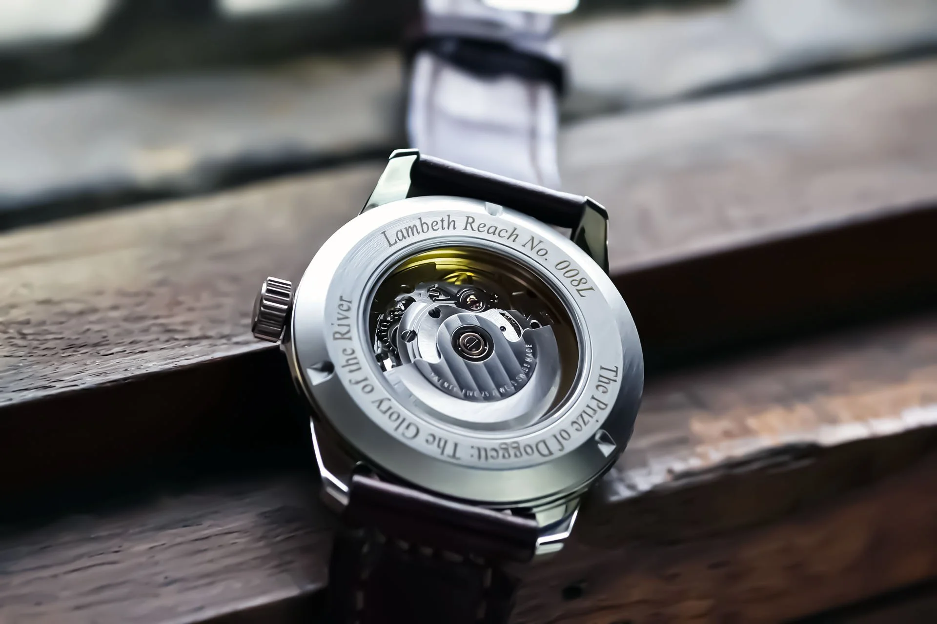 The Lambeth’s contemporary 41mm case is a happy marriage with the traditional dial and hands. The symbology on its dial includes the Hanover Horse, and reflects the Race’s rich heritage through its connections with the Fishmongers’ Company and the Company of Watermen and Lightermen.