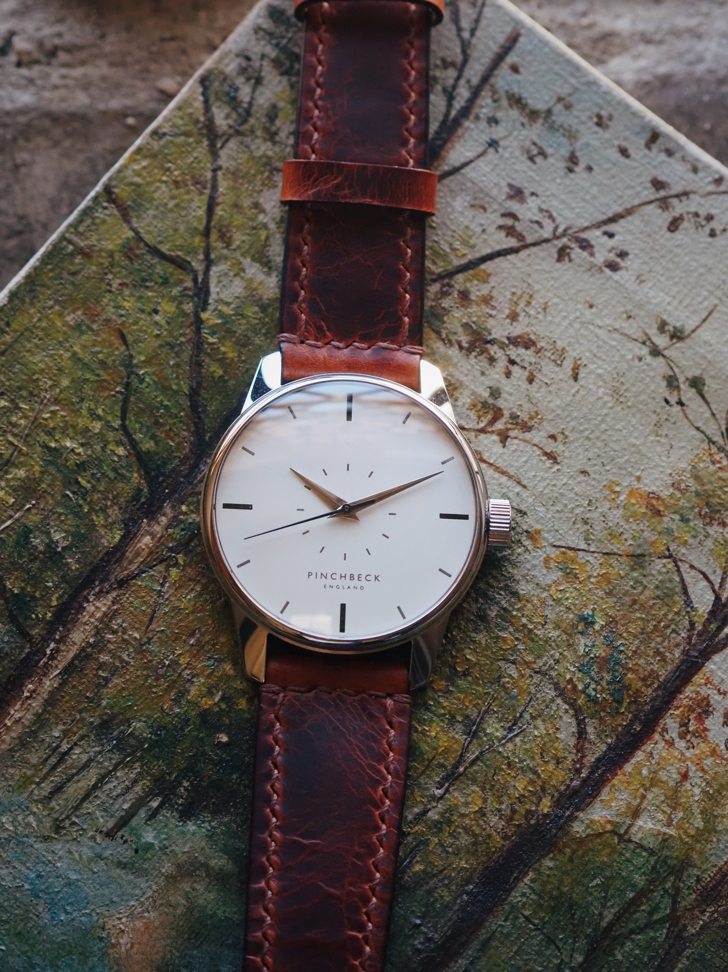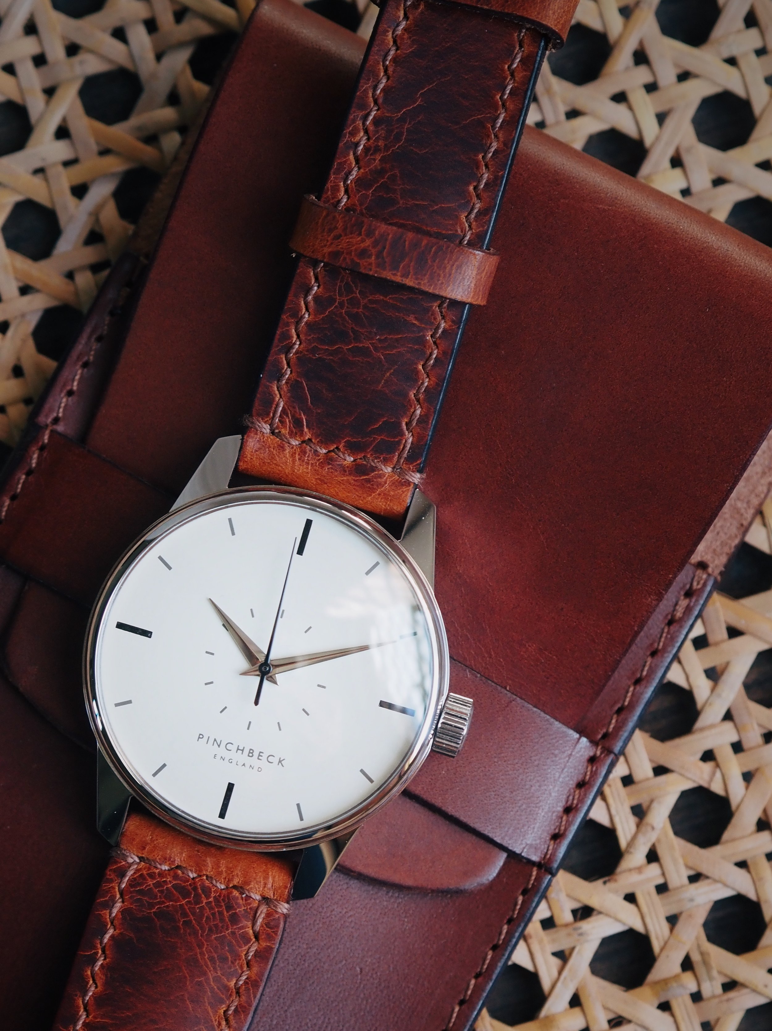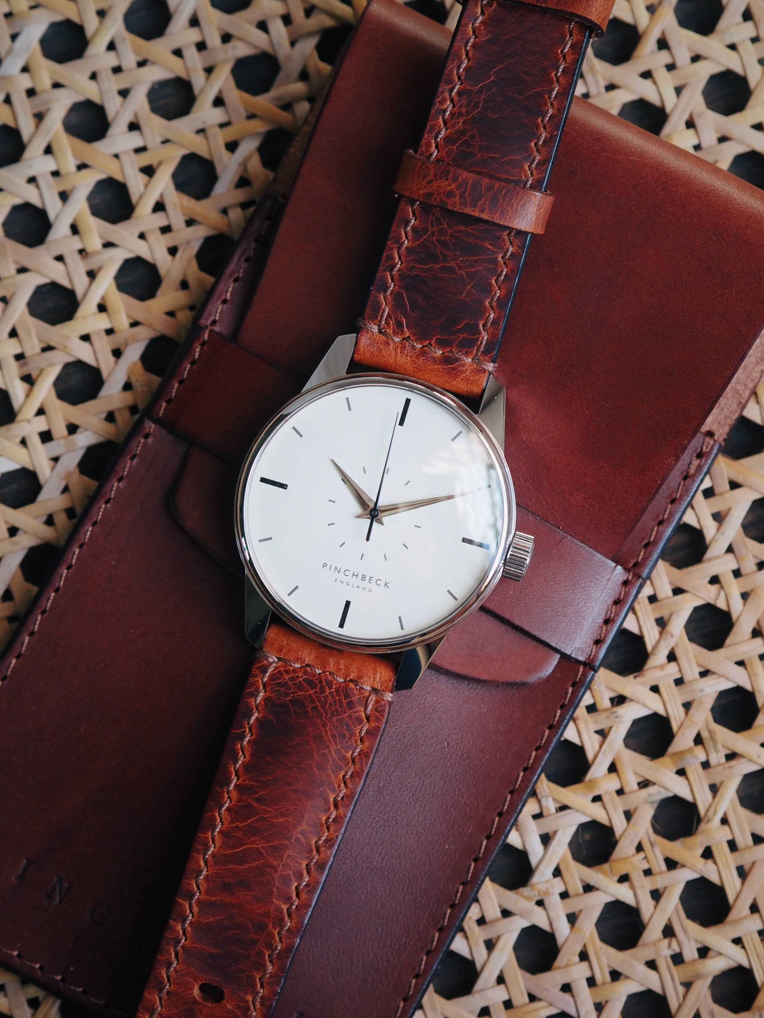 Created specifically for this piece by Tanner Bates, the leather carries a worn, textured character. Rich in tone and tactile in finish, it introduces depth and individuality, a deliberate counterpoint to the smoothness of the dial.