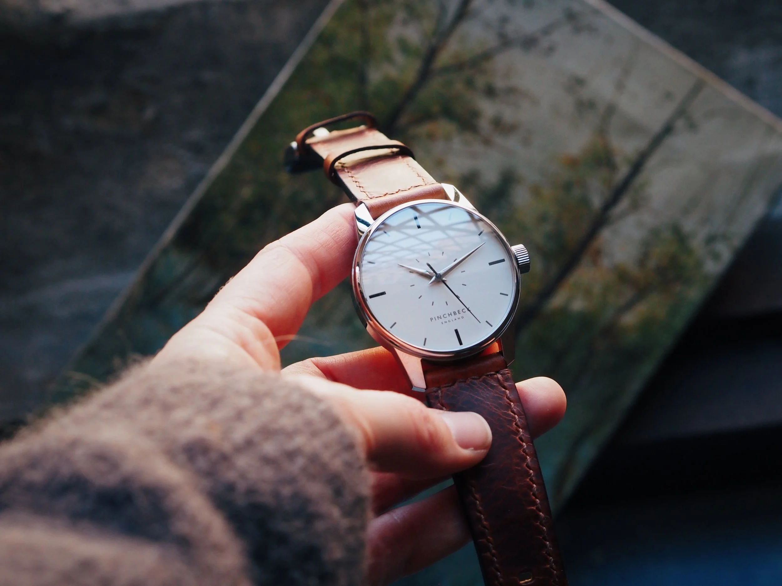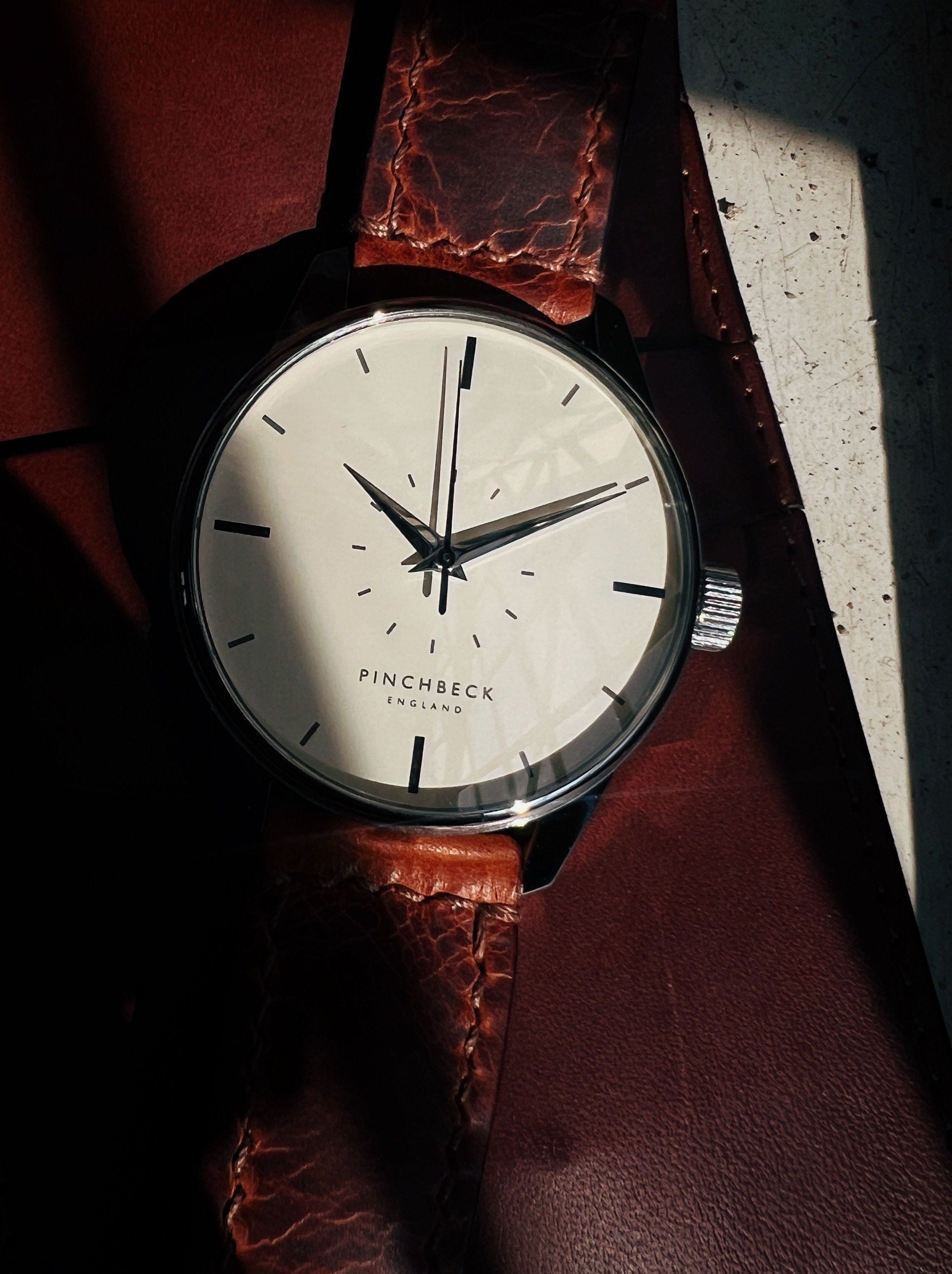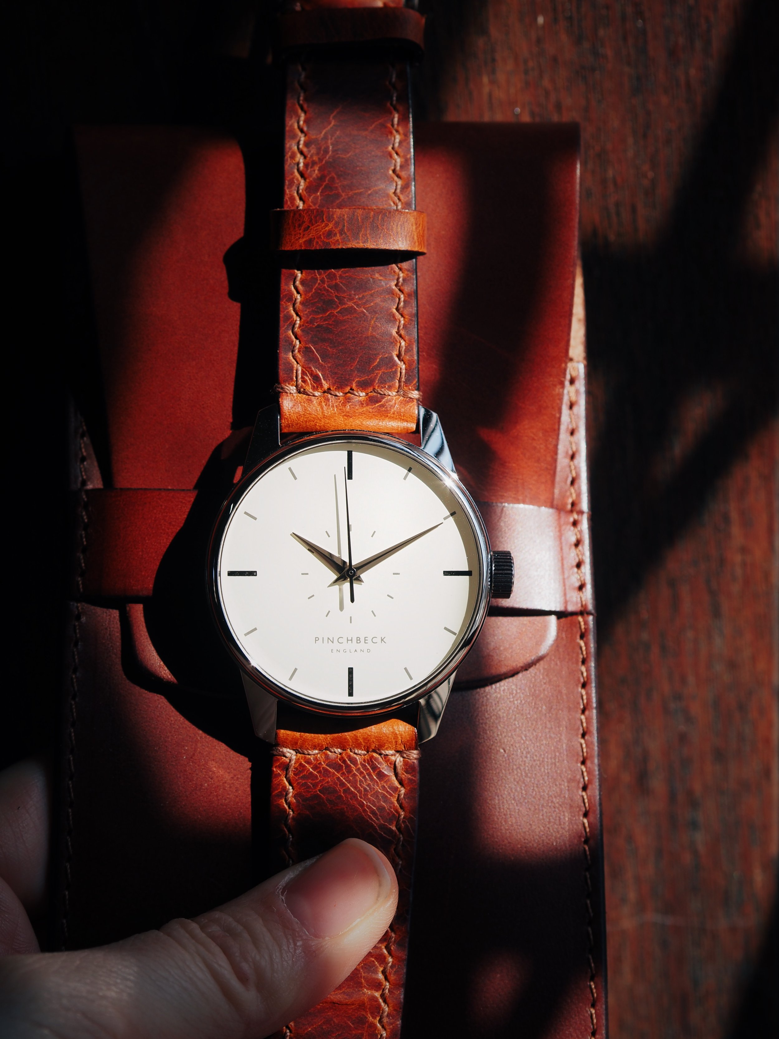 Created specifically for this piece by Tanner Bates, the leather carries a worn, textured character. Rich in tone and tactile in finish, it introduces depth and individuality, a deliberate counterpoint to the smoothness of the dial.